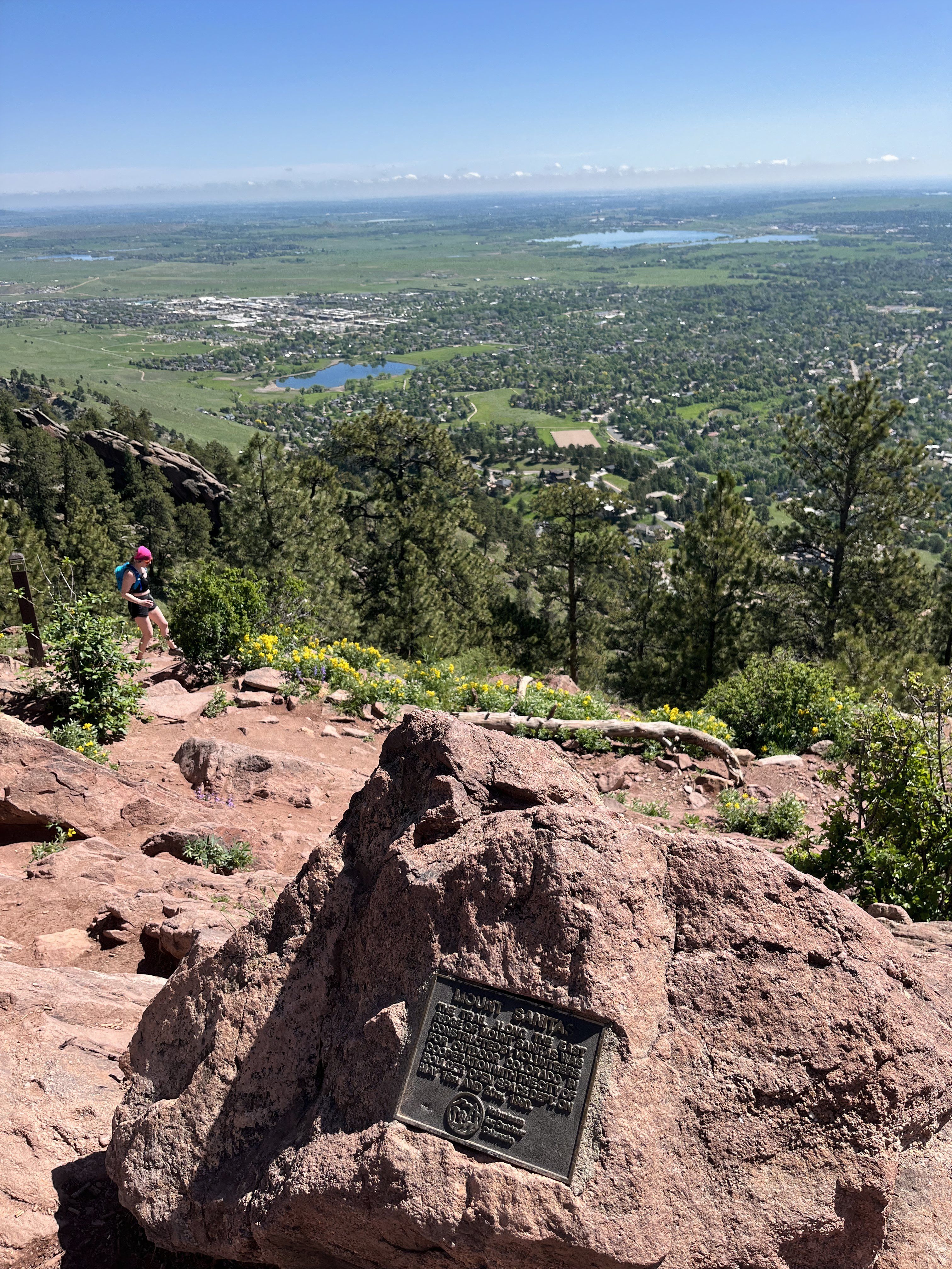 当徒步旅行者上升时,您会穿过岩石地形和之字形路线,偶尔会瞥见下面的博尔德。此次峰会提供了360度城市全景,东边是平原,西边是落基山脉。